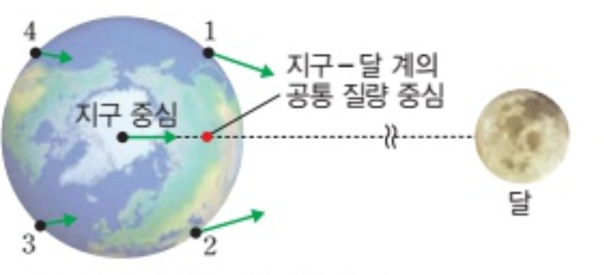 달과 지구는 질량을 가지고 있기 때문에 서로 잡아당기는 만유인력이 작용한다. 만유인력은 두 물체의 질량의 곱에 비례하고 거리의 제곱에 반비례하므로 거리의 영향을 더 많이 받는다. 따라서 1,2 지점에 작용하는 만유인력이 3,4 지점에서보다 크다.